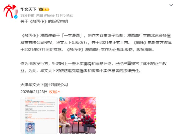 23日,华文天下通过多个官方工作室账号发布申明,称《敖丙传》漫画连载于《一本漫画》,创作内容由饺子监制;漫画单行本由北京彩条屋科技有限公司授权,华文天下出版发行,并于2021年正式上市。《哪吒》电影官方微博于2021年07月同期推荐。《敖丙传》漫画单行本作为正规出版物,版权清晰。